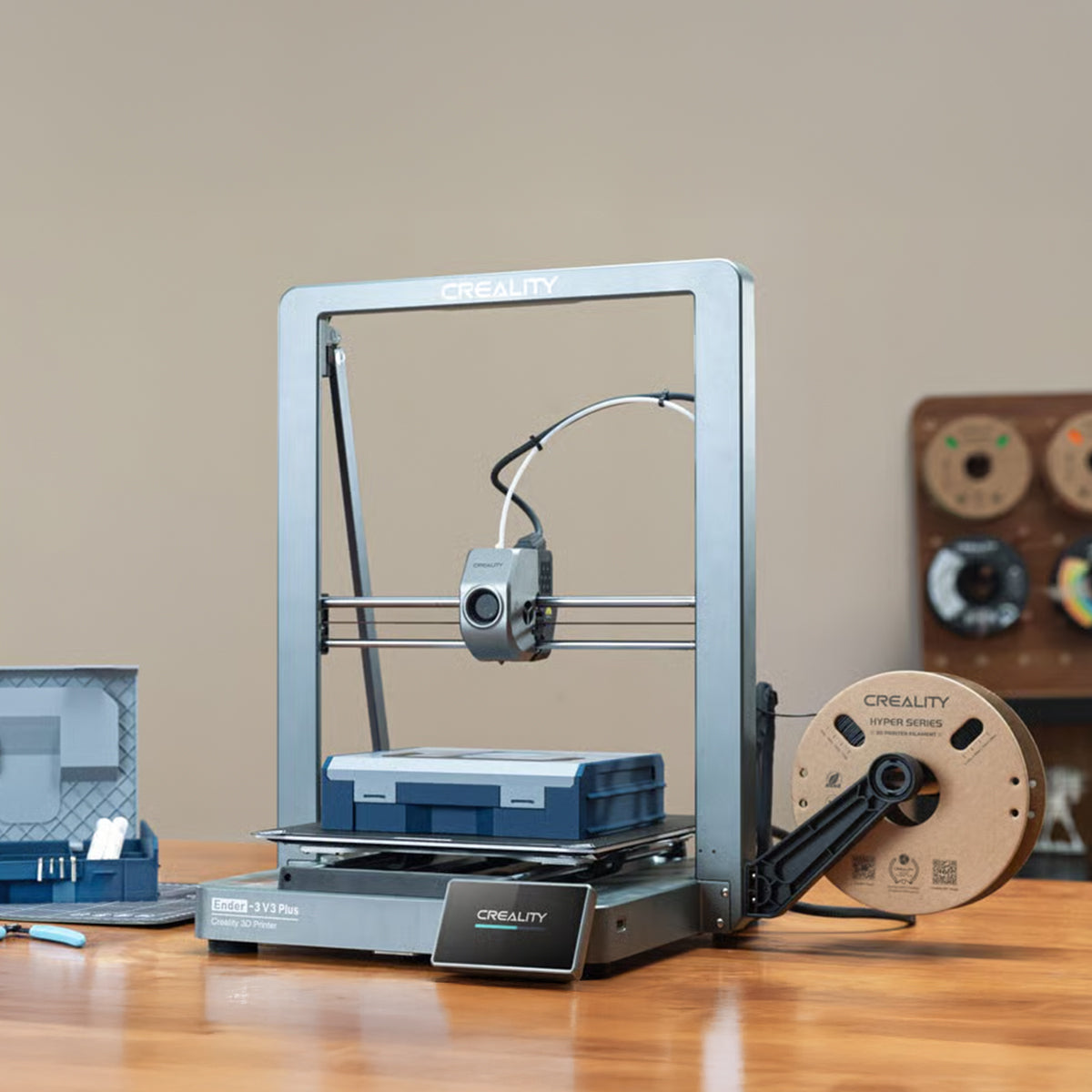 The Creality Ender 3 V3 PLUS is designed for high-performance 3D printing with an expanded build volume of 300x300x330mm, making it ideal for larger projects and multiple parts at once.